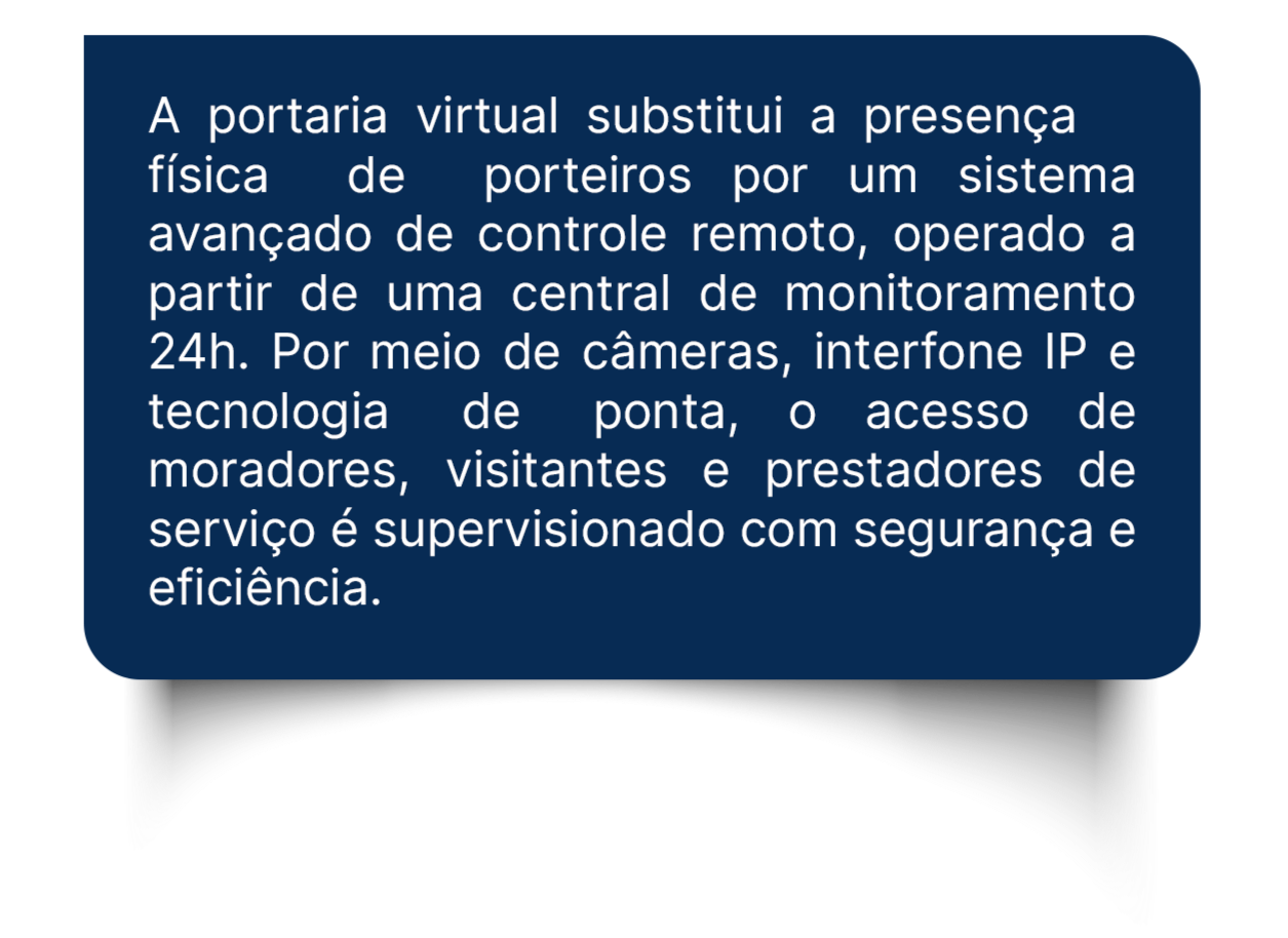 A portaria virtual substitui o porteiro físico por uma central de monitoramento 24h, que realiza o controle de acesso remotamente. A entrada de moradores, visitantes e prestadores é autorizada com base em protocolos definidos pelo condomínio.